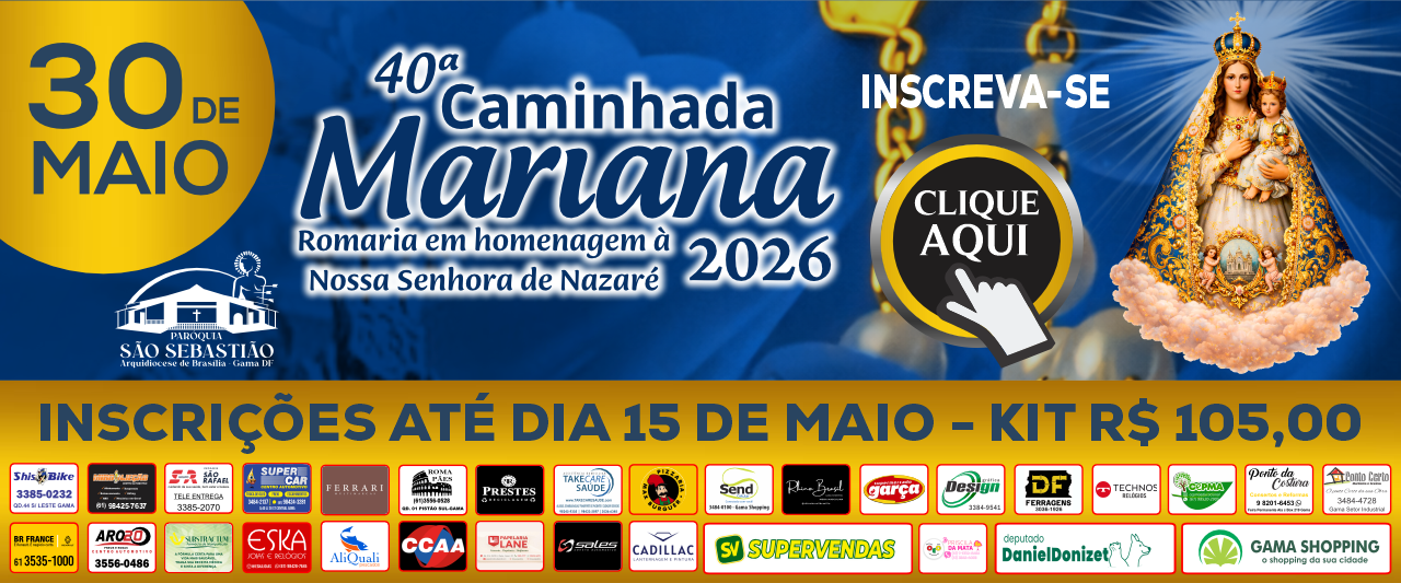 A tradicional CAMINHADA MARIANA ROMARIA EM HOMENAGEM À NOSSA SENHORA DE NAZARÉ 2026 será realizada em 30 de maio de 2026, serão percorridos 32km com saída às 19h30, da Paróquia São Sebastião, no Gama/DF, e chegada às 07h00 na Igrejinha de Fátima, na 307/308 Sul, em Brasília. Garanta sua inscrição e seu kit.